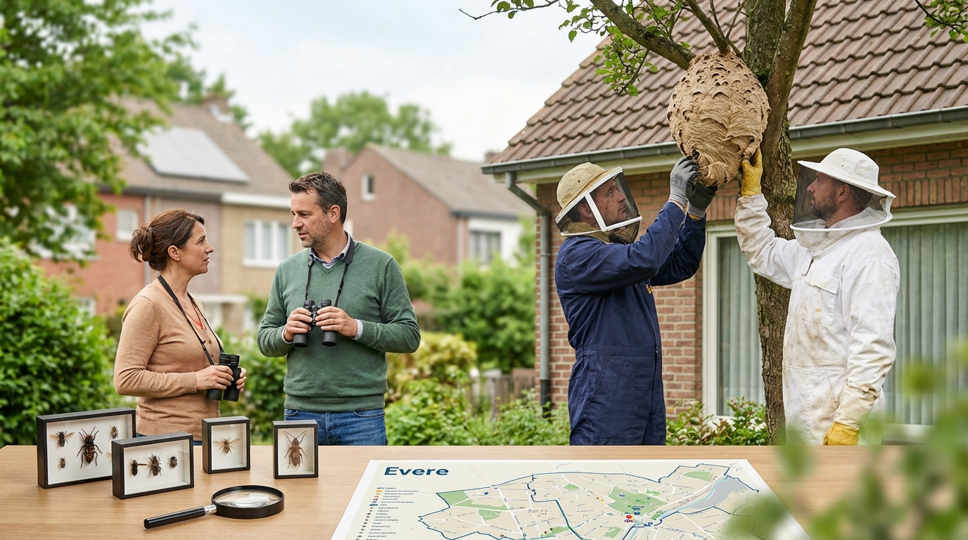 Evere est une commune semi-résidentielle avec un mélange assez particulier : des quartiers pavillonnaires avec jardins, des immeubles à appartements, et des zones vertes comme la réserve naturelle du Moeraske. Ce cocktail crée des conditions parfaites pour les guêpes et les frelons. Les jardins offrent de la nourriture (fruits, poubelles, barbecues), les toitures et les caissons de volets fournissent des abris, et les espaces verts garantissent un approvisionnement en insectes pour nourrir les larves.