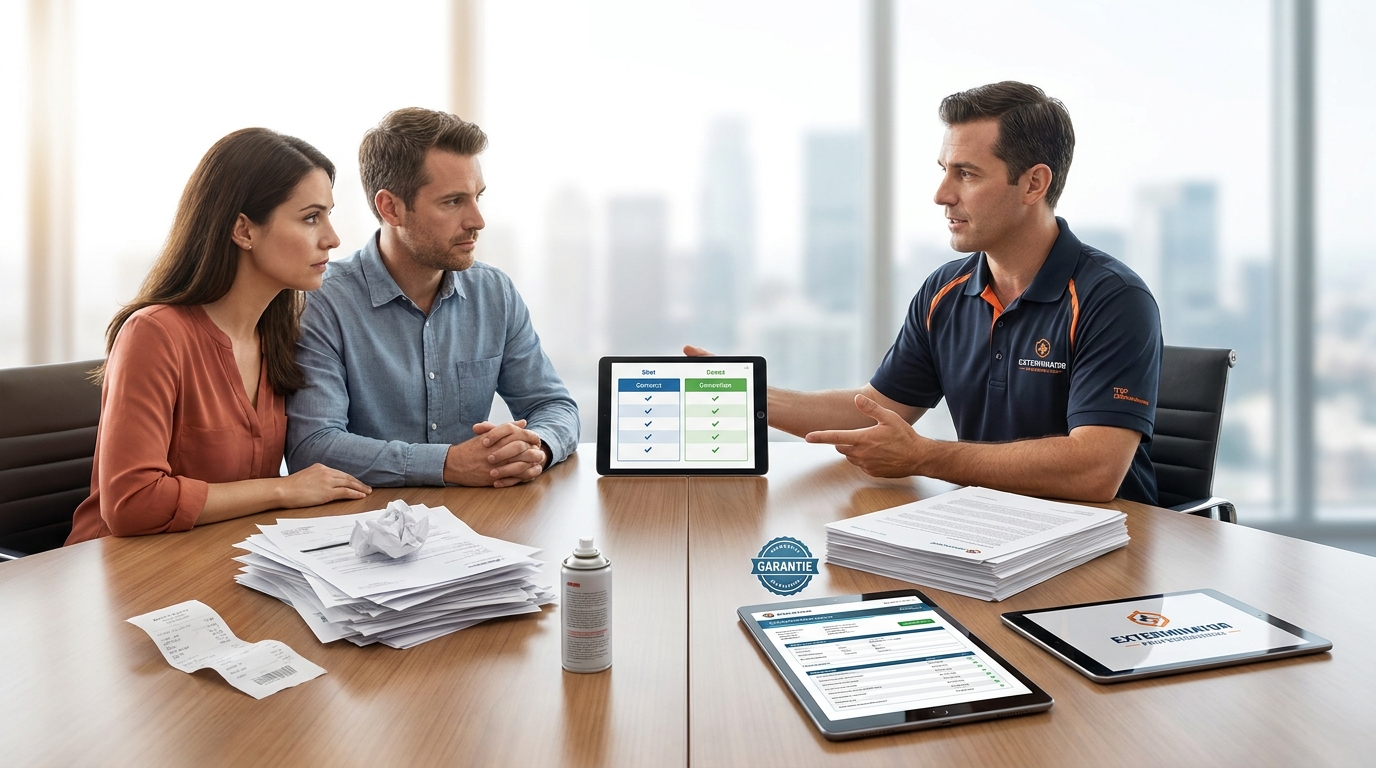 Un expert fiable vous demandera toujours des précisions (photos, hauteur) pour établir un devis gratuit et fixe. Vérifiez qu’il possède un numéro d’entreprise, une assurance responsabilité civile et qu’il utilise des biocides homologués, et non des bombes aérosols de supermarché.